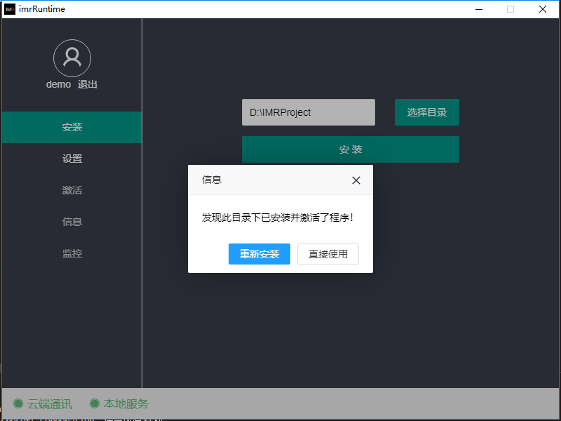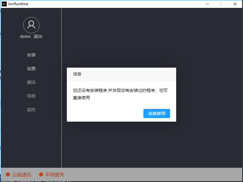 Runtime安装后打开,如果默认目录下(D:\IMRPreject)已有核心程序,则Runtime会检测到,直接使用即可