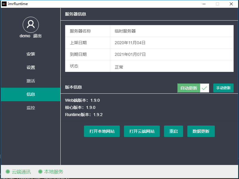 激活并启动成功后,启动页面将显示服务器信息,并可以进行重启和数据更新操作
